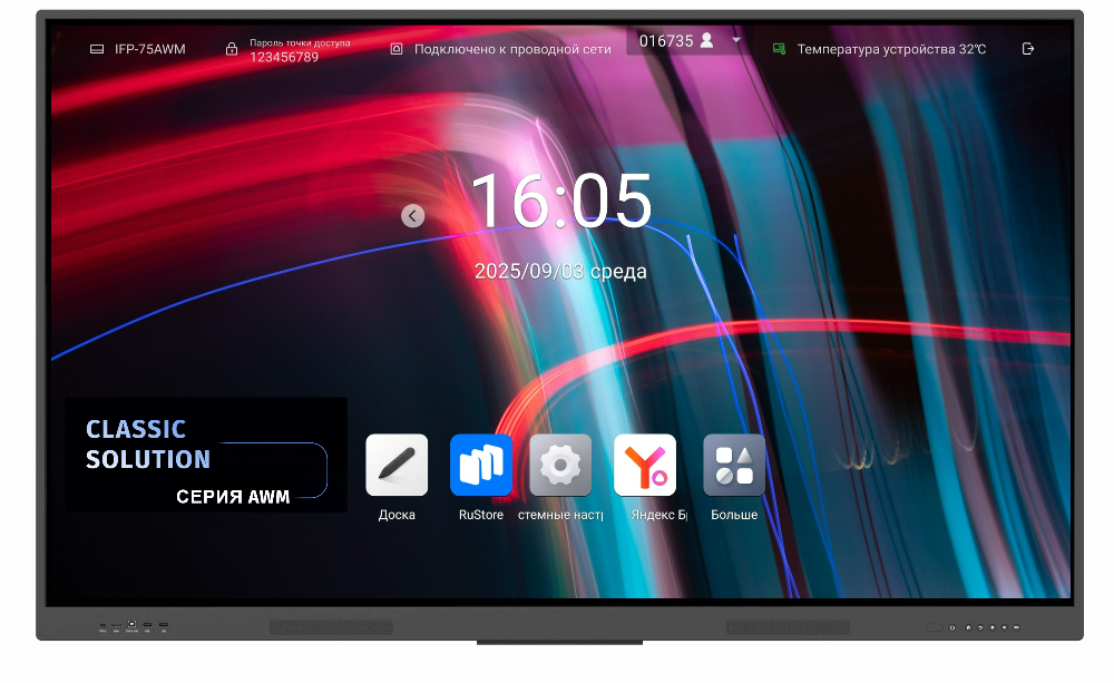 Интерактивный дисплей Classic Solution IFP-75AWM — это современная интерактивная панель 75 дюймов с разрешением Ultra HD (3840×2160), идеально подходящая для школ, офисов и конференц-залов. Благодаря инфракрасной сенсорной технологии с поддержкой 40 точек касания, антибликовому стеклу толщиной 4 мм (прочность 7H) и встроенному компьютеру на Android 14 (8-ядерный процессор ARM Cortex A55 1,5 ГГц, 8 ГБ RAM, 128 ГБ памяти), она обеспечивает плавную multitouch-работу с пальцем, стилусом или любым непрозрачным предметом.